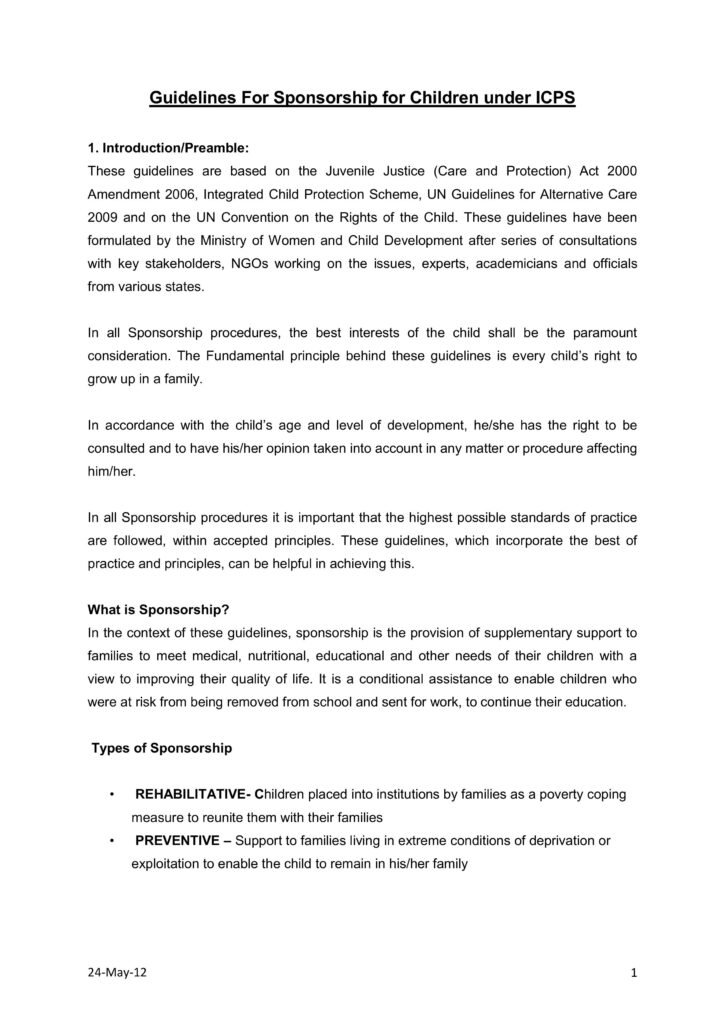 Guidelines for Sponsorship for Children under ICPS, Ministry of Women and Child Development