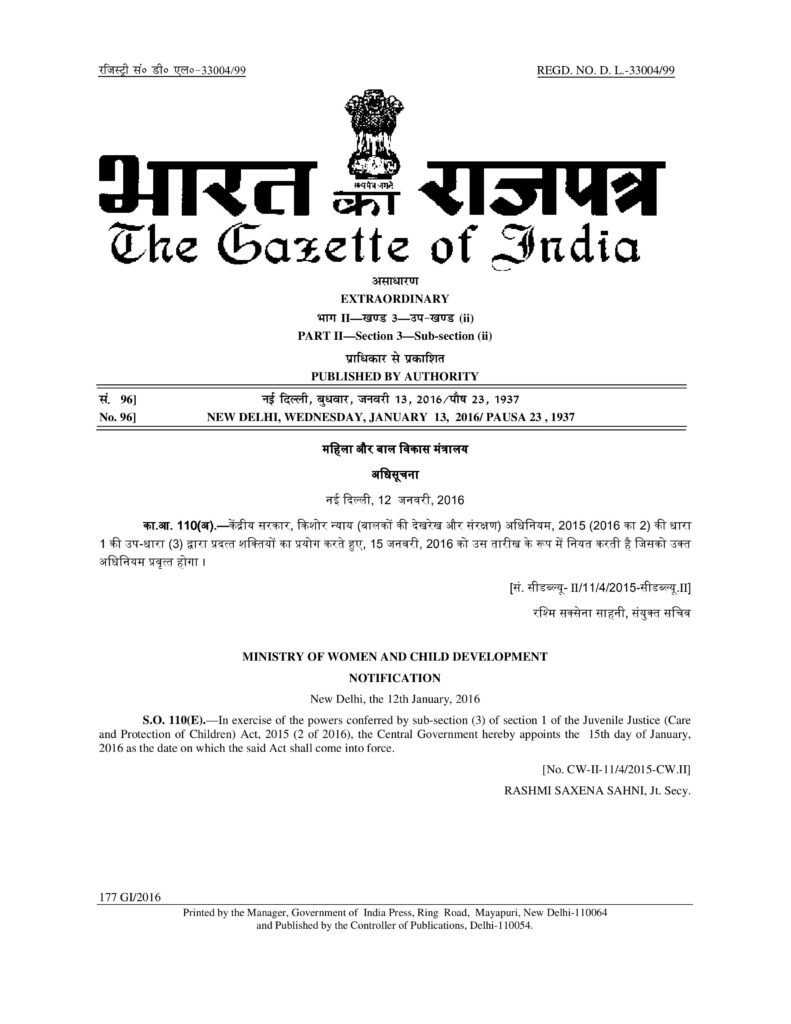 Juvenile Justice (Care and Protection) 2015, Ministry of Women and Child Development 2016