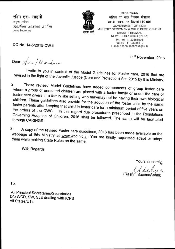 Model Guidelines for Foster Care, Ministry of Women and Child Development, 2016