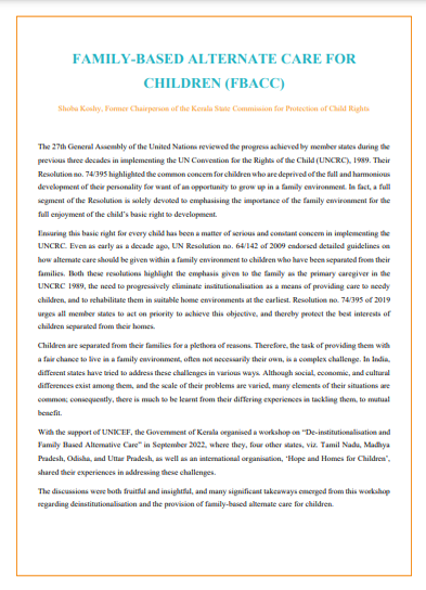This report talks about the significant takeaways from the workshop on “De-institutionalisation and Family Based Alternative Care” organised by the Government of Kerala with the support of UNICEF, where they, four other states, viz. Tamil Nadu, Madhya Pradesh, Odisha, and Uttar Pradesh, as well as a n international organisation, ‘Hope and Homes for Children’, shared their experiences in addressing these challenges.