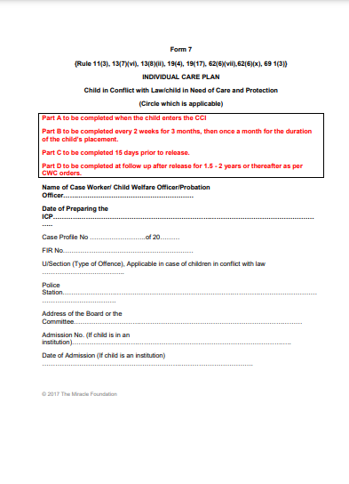 Every child is unique and has a unique set of needs. Individual care plan ( ICP) is required for understanding and assessing the progress of the education, vocational training, physical and mental health needs of a child while in the care system. It was realised that in the absence of any guidelines related to areas of concerns and proposed interventions, most of the domains remained either empty or checked as not applicable in the ICP form. The additions provide a holistic view of the child's background and help in effective planning and decision regarding placement and well-being of the child. Therefore Miracle has made necessary additions (in red) in the ICP form without deleting any point from the existing ICP form in Juvenile Justice (Care and Protection) Act 2015. These guidelines will be particularly useful to the Social Worker/Probation Officer who prepare plans and to the District Child Protection Units (DCPU) which monitor them. The ICP form with addendum by Miracle Foundation India has been widely used by the Social workers in Miracle mentored Child Care Institutions (CCI) since 2018, and they found a transformational difference in the child and family assessment with a crisp and clear intervention plan. It helped them in making a decision about the child through the case management process in consultation with the child and family members. Under a joint partnership with the State Departments, UNICEF and Miracle Foundation India, the use of ICP with the addendum has been started by some DCPU officials in Gujarat, Jharkhand, Bihar and Maharashtra. Most of the participants have shared feedback with Miracle team that they found the ICP addendums useful reference to support them in conducting and authentically filling up the ICP form for children. Udayan Care referred to the Miracle Foundation India addendum to the ICP form for preparing Individual Care plan (ICP) guidelines for children in the age group of 15 to 18 years for their After Care Model Program in Bihar.