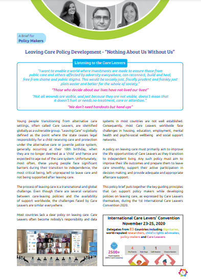 The process of leaving care is a transnational and global challenge. Even though there are several variations between care-leaving policies and the availability of support worldwide, the challenges faced by Care Leavers are similar everywhere. Most countries lack a clear policy on leaving care. Care Leavers often become nobody’s responsibility and data systems in most countries are not well established. Consequently, most Care Leavers worldwide face challenges in housing, education, employment, mental health and psycho-social wellbeing and social support networks. A policy on leaving care must primarily aim to improve the life opportunities of Care Leavers as they transition to independent living. Any such policy must aim to improve their life outcomes and prepare them to leave care smoothly; support their active participation in decision making, and provide adequate and appropriate aftercare support. This policy brief puts together the key guiding principles that can support policy makers while developing policies on leaving care, as expressed by Care Leavers themselves, during the 1st International Care Leavers Convention 2020.