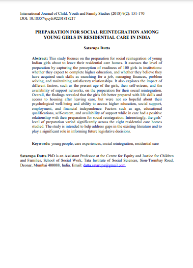 This study focuses on the preparation for the social reintegration of young Indian girls about to leave their residential care homes. It assesses the level of preparation by capturing the perception of readiness of 100 girls in institutions: whether they expect to complete higher education, and whet her they believe they have acquired such skills as searching for a job, managing finances, problem-solving, and maintaining satisfactory relationships. It also explores the impact of different factors, such as the present age of the girls, their self-esteem, and the availability of support networks, on the preparation for their social reintegration. Overall, the findings revealed that the girls felt better prepared with life skills and access to housing after leaving care, but were not so hopeful about their psychological well-being and ability to access higher education, social support, employment, and financial independence. Factors such as age, educational qualifications, self-esteem, and availability of support while in care had a positive relationship with their preparation for social reintegration. Interestingly, the girls’ level of preparation varied significantly across the eight residential care homes studied. The study is intended to help address gaps in the existing literature and to play a significant role in informing future legislative decisions.