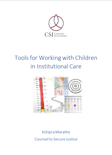 This knowledge resource discusses and provides examples of practice tools, worksheets and calming techniques (in English and Hindi) which counsellors and adults can use while working with children who are in institutional care. These tools are developed and compiled by Counsel to Secure Justice (CSJ ) based on experiences and interventions of working with children in institutions. Along with the tools, the paper reviews evidence on the impact of institutionalisation on children and evidence-based interventions that can help mitigate this impact while interweaving CSJ’s experiences and interventions. The latter part of the paper presents tools and calming techniques in the form of worksheets and pictorial representations. The tools and techniques in this resource are part of CSJ’s interventions with children in CCIsincluding in the form of in-person interactions/counselling, virtual interventions during COVID 19 and the restorative circle processes. The tools are developed and compiled to provide visual aid and illustration during counselling and other interactions with children. The exercises can help in engaging children to think and express. The tools can help build rapport and work with children who find it difficult to express their emotions and experiences verbally. The worksheets and calming techniques around coping can help the children practise the coping techniques and equip them to use it for themselves. CSJ understands these tools have limitations and are examples of practice tools and techniques adapted or modified by the counsellors. These are not a replacement of in-person, telephonic, individual or group counselling, therapy or any psychological/psychiatric intervention for severe mental health conditions and disorders. None of these tools can be used for psychological or psychometric testing or diagnosis.